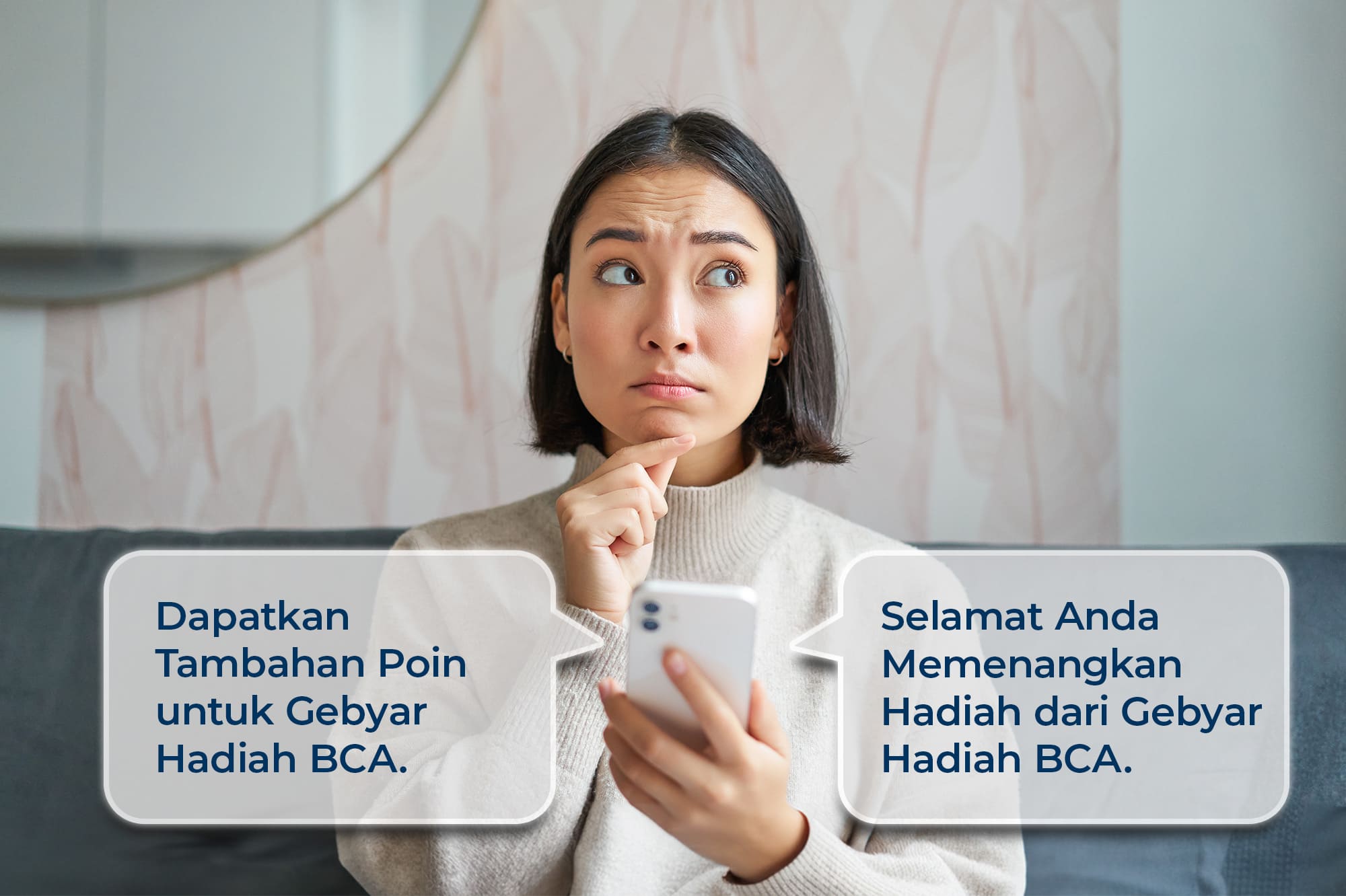 Selalu waspada dengan berbagai modus penipuan yang mengatasnamakan BCA atau program Gebyar Hadiah BCA. Cek informasi di bawah untuk mengetahui jenis-jenis modus penipuan mengatasnamakan program Gebyar Hadiah BCA.