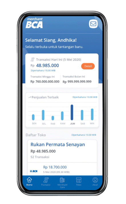 BCA senantiasa di sisi nasabah turut melakukan inovasi dalam solusi bisnis digital bagi pelaku usaha untuk mengelola bisnis dan meningkatkan kelancaran usaha. Melalui Aplikasi Merchant BCA, pelaku usaha dapat melakukan pengajuan merchant baru, akses dashboard dan laporan transaksi dengan mudah hanya dalam genggaman.