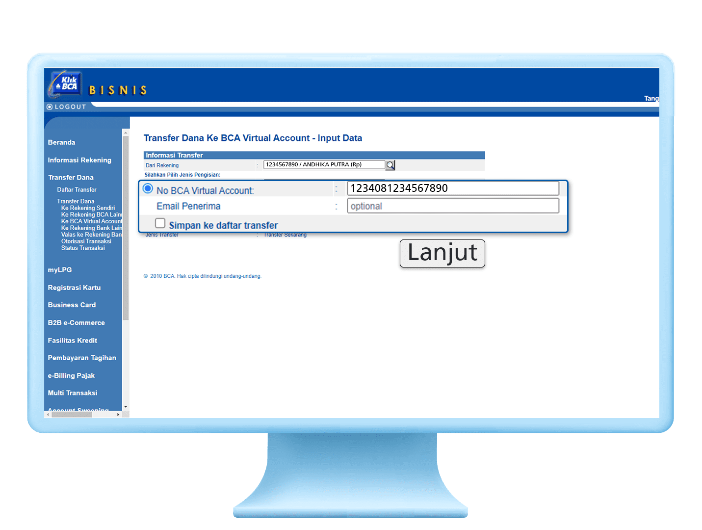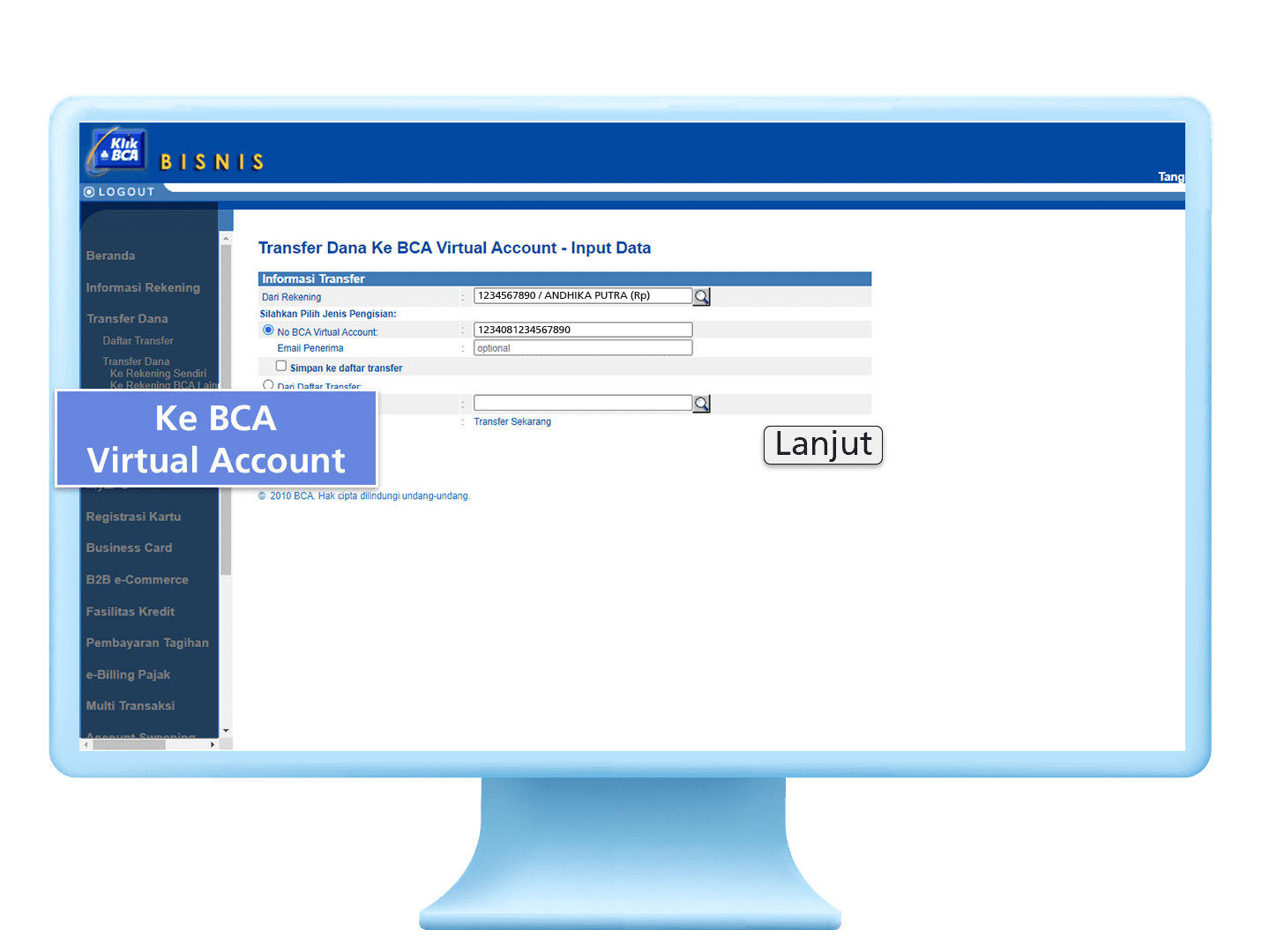 3. Masukkan nomor BCA Virtual Account dan klik “Lanjutkan”
