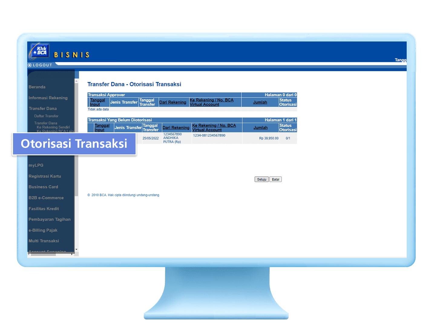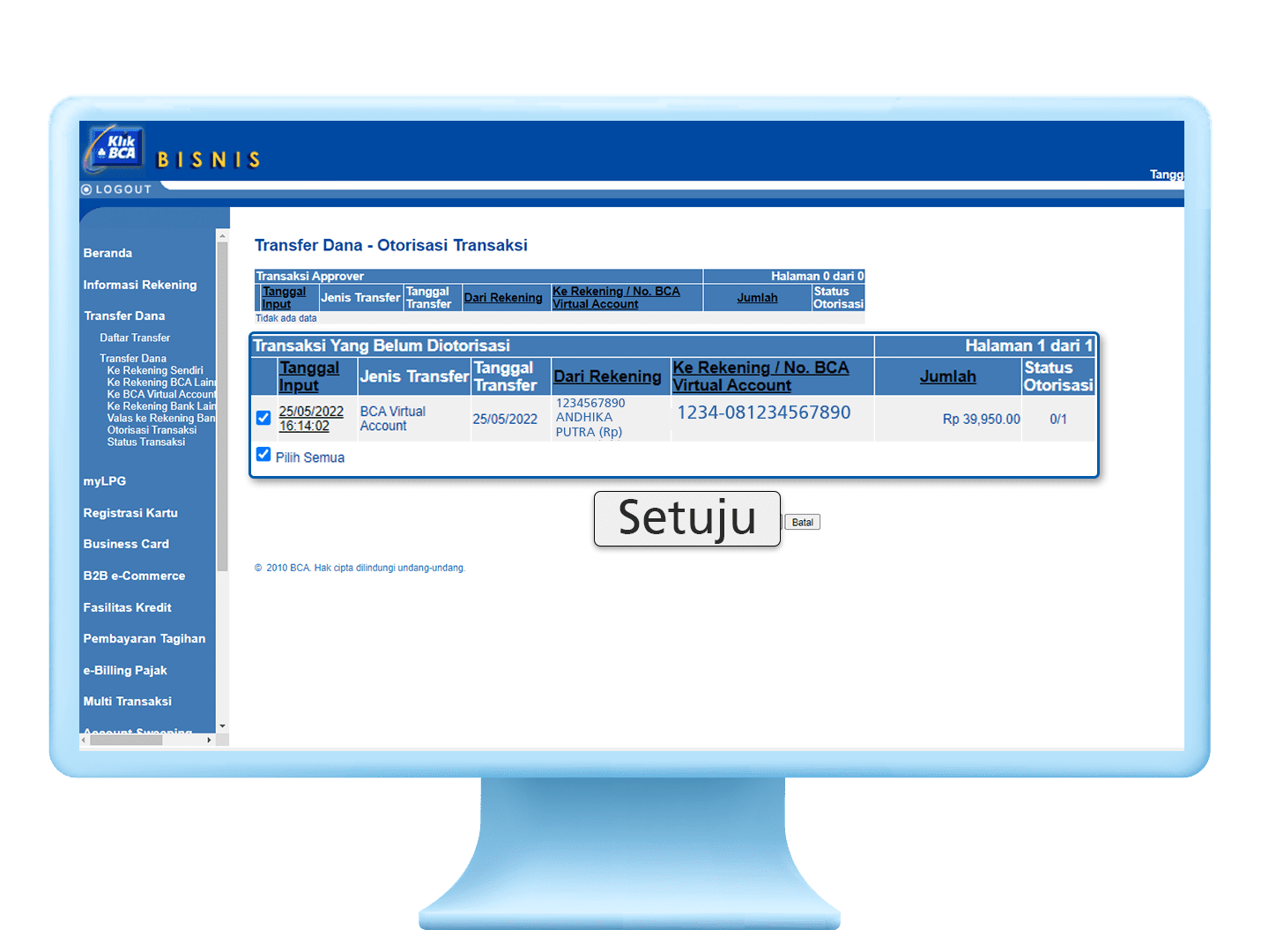 5. Pilih transaksi BCA Virtual Account yang sudah disimpan, klik “Setuju”